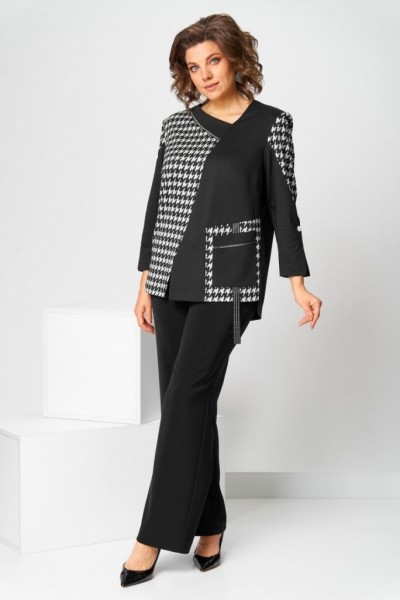 Костюм брючный (двойка) женский полуприлегающего силуэта, состоит из джемпера и брюк. Костюм выполнен и трикотажного полотна и брючной ткани. Джемпер без застежки, рукав длинный с фигурной вставкой. По низу разрез. Горловина фигурная V-образная со вставкой, декорированной тесьмой с имитацией "молнии". Перед с асимметричным подрезом в области бедра вставка с карманом с отделочной тесьмой. По переду внизу разрез по рельефу. По боковым швам внизу разрезы. Спинка свободная. Брюки классические, со стрелками на поясе с резинкой. Застежка на гульфик, на тесьму-молнию. Вверху косые карманы.
