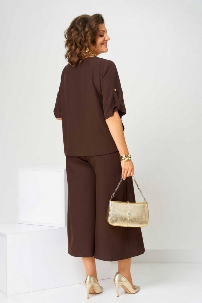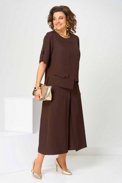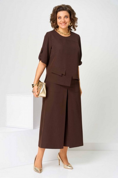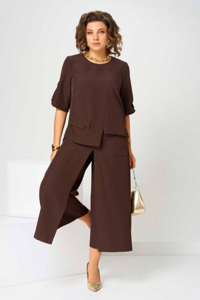 Костюм женский свободного силуэта, выполнен из костюмной ткани. Блузка с рукавами 7/8. Перед с ассиметричной кокеткой и рельефом, ниже уровня талии фигурный клапан. Спинка свободная. Низ блузки фигурный разноуровневый. Юбка-брюки на кокетке, с накладными карманами. Застежка на тесьму-молнию в боковом шве.