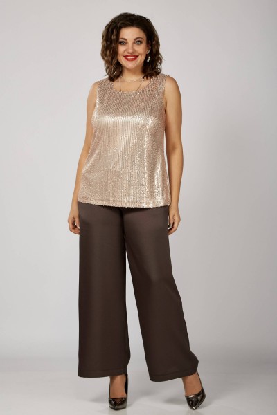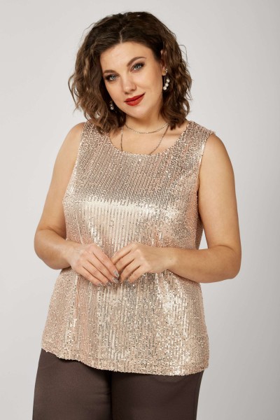 Блуза выполнена из трикотажного полотна с эффектом «пайеток», на подкладке, контрастного цвета. По переду расположены нагрудные вытачки. Блуза без рукавов. Горловина округлой формы.