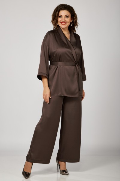 Жакет – кимоно свободной формы, прямого силуэта, покроя спущенное плечо. Перед и спинка цельные, рукава прямые одношовные, длиной ¾. Горловина оформлена воротником «шаль», в боковых швах разрезы. По переду расположены нагрудные вытачки. Жакет и брюки выполнены из атласной струящейся ткани. К жакету прилагается пояс из основной ткани.