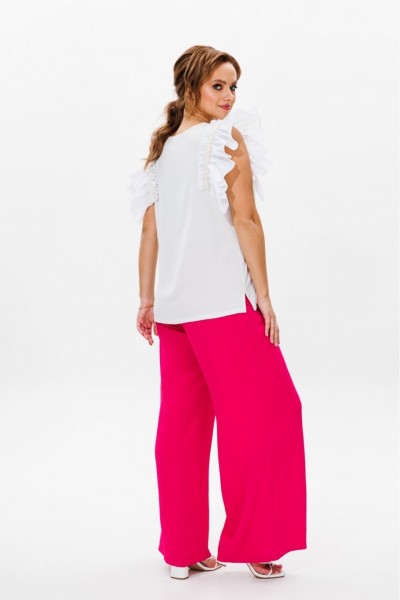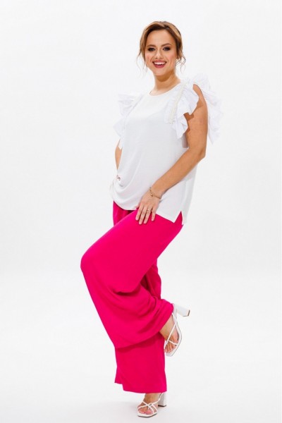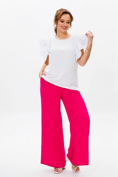 Летний женский костюм, состоящий из брюк и нарядной блузы, выполненный из костюмно-блузочной ткани (тянется).