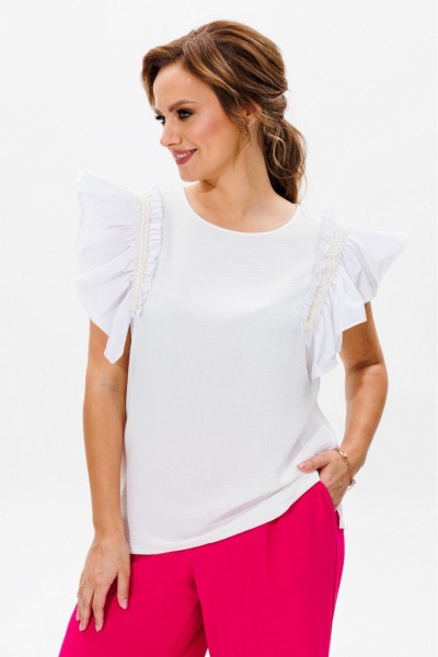 Блуза прямого силуэта с разрезами по бокам. Горловина округлой формы, обработанная окантовкой. Рукава в блузе в виде рюши из тафты, которые декорированы тесьмой с бусинами.