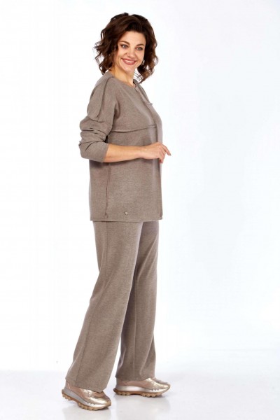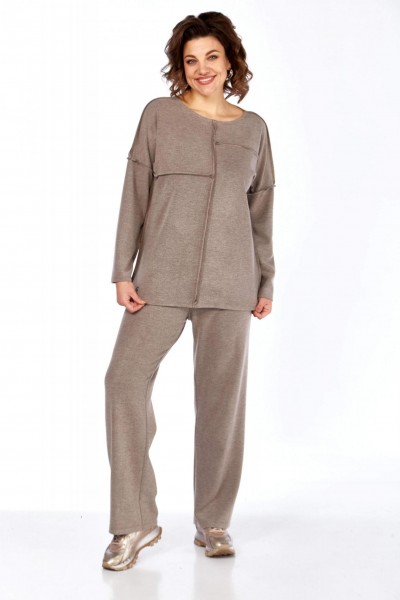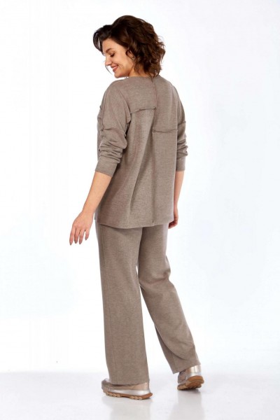Комплект брючный : джемпер и брюки из трикотажного полотна. Джемпер с разрезными на 4 части передом и спинкой,швы обработаны припусками на лицо. Горловина округллой формы обработана распошивочным швом. Низ рукава и изделия тоже обработаны распошивочным швом. Брюки прямые. Цельнокроенный пояс на резинке.