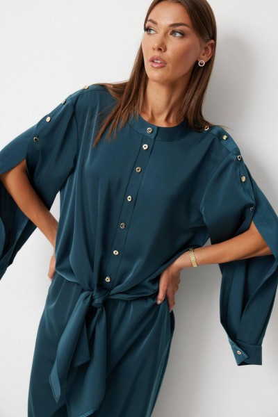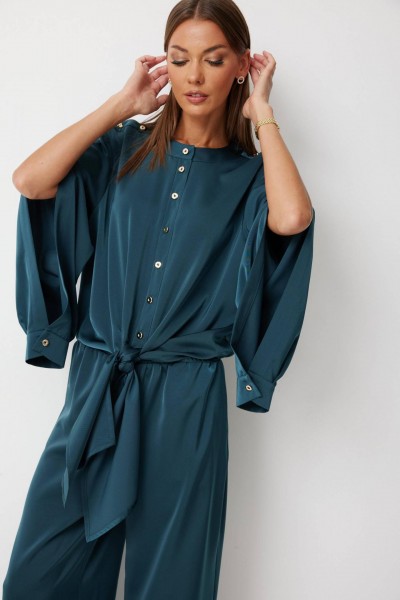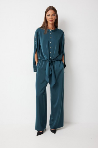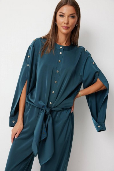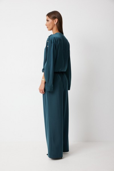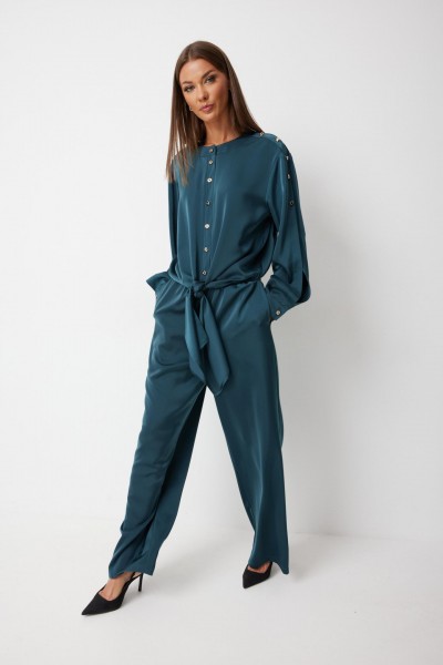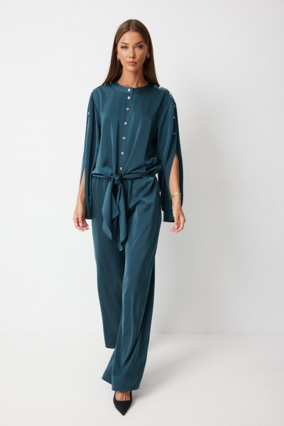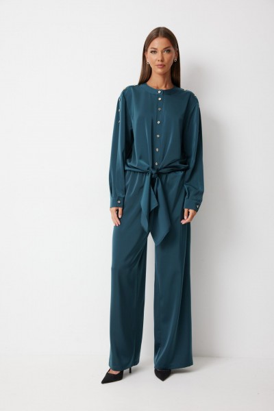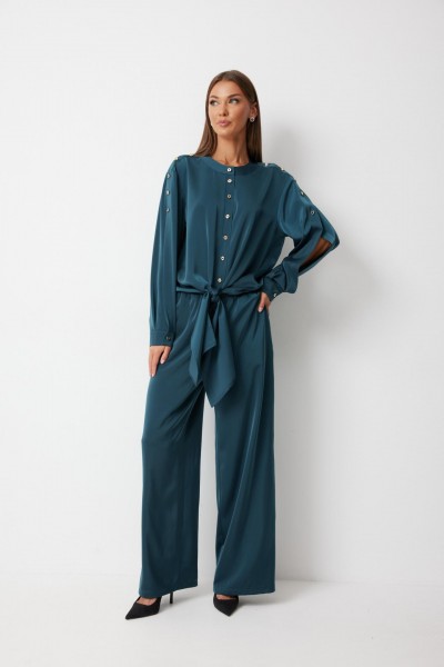 Костюм женский состоящий из блузки и брюк. Блузка прямого силуэта с втачными фантазийными рукавами и разноуровневой линией низа. Блузка по переду предполагает завязку полочек и застегивается на петли пуговицы. Спинка блузки обработана резинкой по нижнему срезу. Горловина блузки обработана отрезной стойкой. Рукав с плечевым швом застегивается на декоративные пуговицы. По низу рукава расположена складка, рукав обработан притачной манжетой застегивающейся на петлю и пуговицу. Брюки прямого силуэта полной длинны В боковых швах брюк обработаны карманы. Верх брюк обработан отрезным поясом «на резинке». Цвет материала может отличаться по тону в зависимости от настроек вашего монитора.