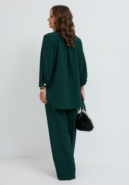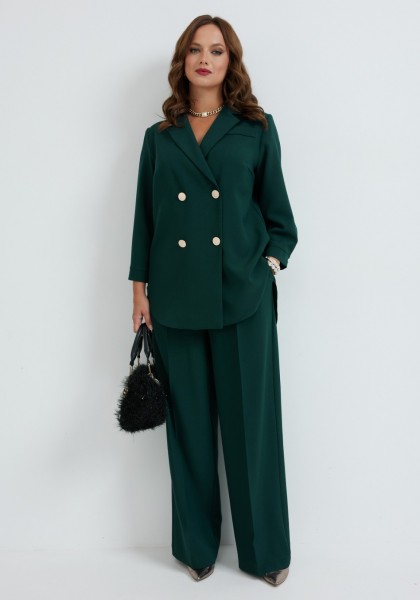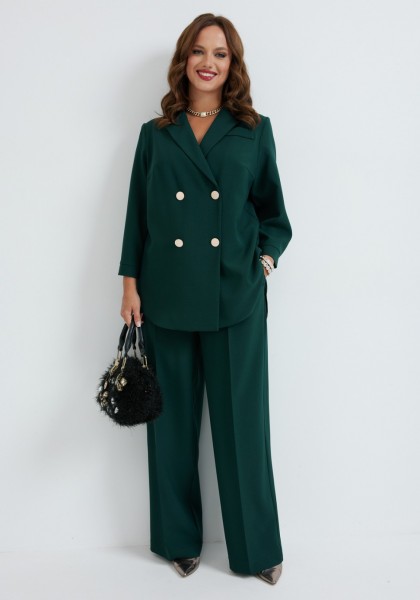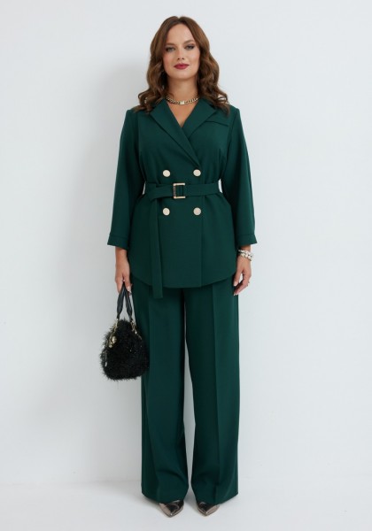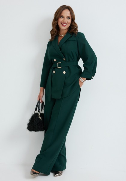 Костюм состоит из жакета и брюк. Качественная поливискоза, из которой выполнена модель, обеспечит долговечность изделию и приятные ощущения его обладательнице. Жакет без подкладки прямого силуэта, с двубортной застежкой на петли-пуговицы, длиной до середины бедра. Перед жакета с нагрудными вытачками, в области груди расположена декоративная листочка. Спинка с двойной кокеткой, в шве притачивания которой обработана встречная складка. Низ жакета фигурный, с закруглениями по боковым швам. Рукава двушовные, длиной 3/4, по низу с манжетой, застегивающейся на петлю и пуговицу. Горловина оформлена воротником пиджачного типа. Брюки классической формы, прямые от линии бедер, со стрелками по передним и задним половинкам. Верхний срез обработан поясом, в который от бокового шва вставлена резинка по задним половинкам. В боковых швах обработаны наклонные карманы. На задних половинках расположены талиевые вытачки. В комплект входит пояс из основной ткани.
