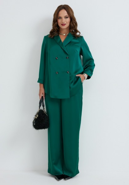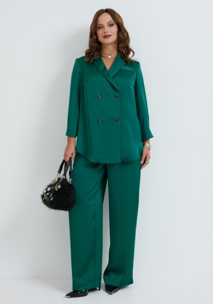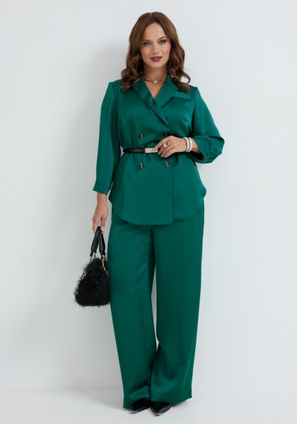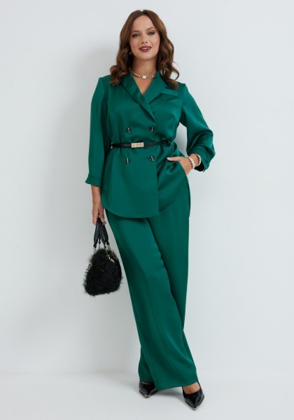 Костюм состоит из жакета и брюк. Качественная вискоза, из которой выполнена модель, обеспечит долговечность изделию и приятные ощущения его обладательнице. Жакет без подкладки прямого силуэта, с двубортной застежкой на петли-пуговицы, длиной до середины бедра. Перед жакета с нагрудными вытачками, в области груди расположена декоративная листочка. Спинка с двойной кокеткой, в шве притачивания которой обработана встречная складка. Низ жакета фигурный, с закруглениями по боковым швам. Рукава двушовные, длиной 3/4, по низу с манжетой, застегивающейся на петлю и пуговицу. Горловина оформлена воротником пиджачного типа. Брюки классической формы, прямые от линии бедер, со стрелками по передним и задним половинкам. Верхний срез обработан поясом, в который от бокового шва вставлена резинка по задним половинкам. В боковых швах обработаны наклонные карманы. На задних половинках расположены талиевые вытачки. В комплект входит ремень.