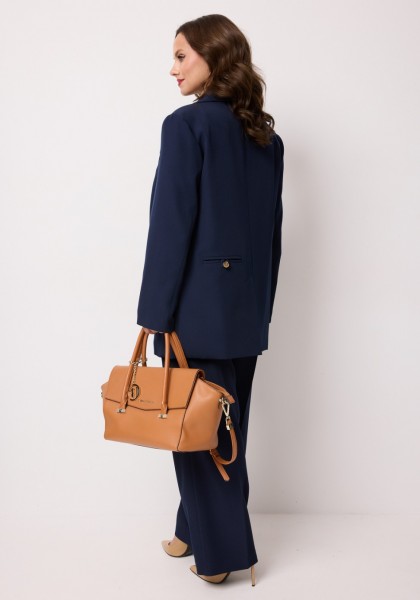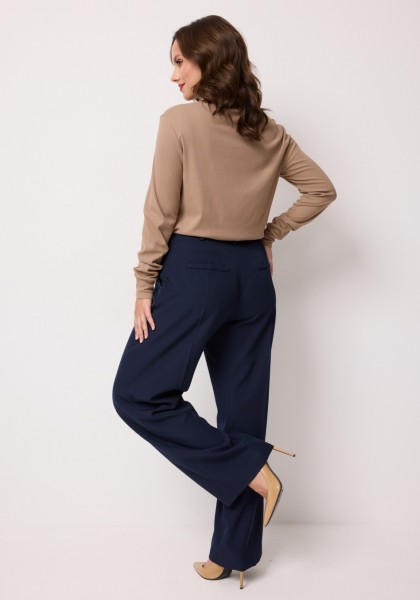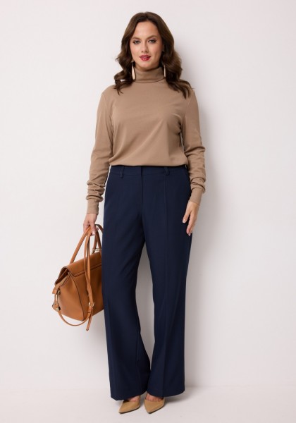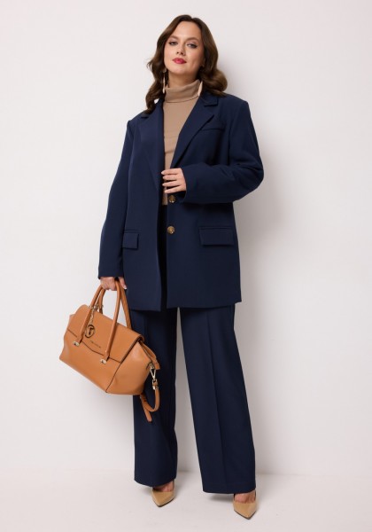 Элегантный костюм-тройка, состоящий из жакета, джемпера и брюк. Жакет и брюки выполнены из костюмной ткани, джемпер — из трикотажного полотна. Жакет прямого силуэта, с застежкой на две петли и две пуговицы. Перед жакета с нагрудной вытачкой, с прорезными карманами в рамку с клапаном. Спинка жакета со средним швом, заканчивающийся шлицей, левая часть спинки с прорезным карманом в рамку, вход в который фиксирует навесная петля с пуговицей. Рукава двухшовные втачные. Горловина оформлена воротником пиджачного типа. Джемпер прямого силуэта, выполнен из вискозы. Перед и спинка цельнокроенная. Рукав длинный. Горловина типа "водолазка". Длина изделия - середина бедра. Брюки классической формы, прямого силуэта, со стрелками по передним и задним половинкам. Верхний срез обработан обтачным поясом. На задних половинках расположены талиевые вытачки, с декоративными листочками. В боковых швах брюк - наклонные карманы. Застёжка центральная на тесьму молнию и крючок.