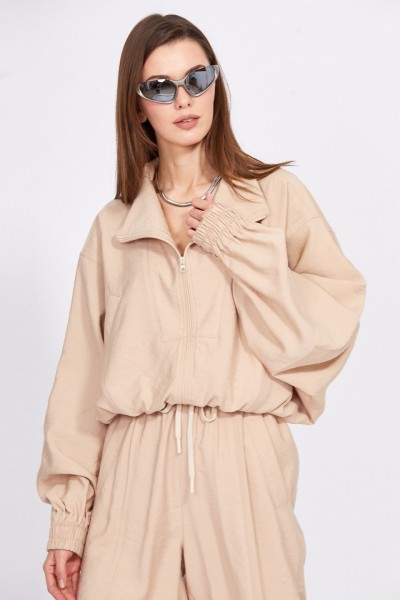 Комплект: куртка + брюки. Комплект выполнен из однотонного гладкокрашенного полотна с крэш-эффекто Куртка покроя кимоно, на притачном поясе с эластичной тесьмой. Застежка спереди на молнию. Спереди прорезные карманы с листочкой и кокетка, переходящая в воротник-стойку. Рукав цельнокроенный, с горизонтальными и вертикальными подрезами, на притачной манжете с эластичной тесьмой. Брюки свободного покроя, на цельнокроенном поясе с эластичной тесьмой, заужены к низу. В пояс вставлен шнур. Спереди вертикальные рельефы и прорезные карманы с листочкой. Низ брюк на манжете с эластичной тесьмой. По боковому шву накладные карманы.