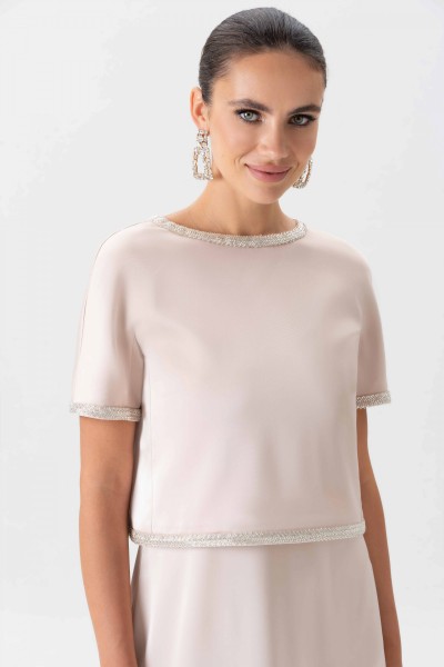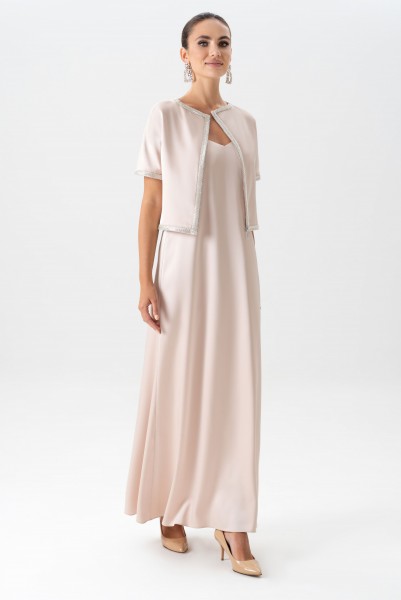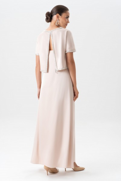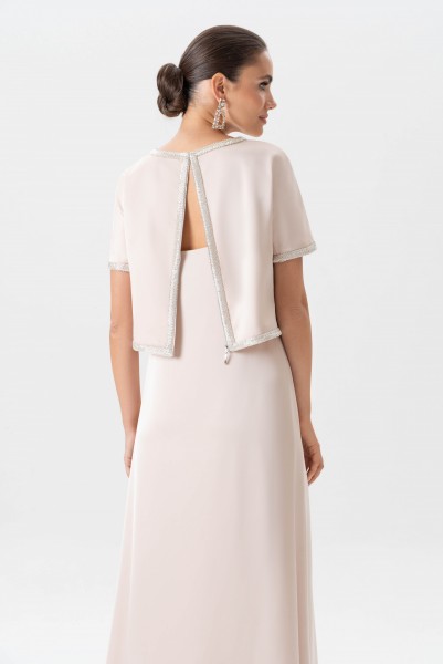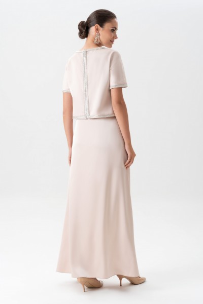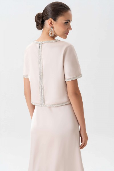 Низ переда, спинки и рукавов, горловина, застежка спинки вдоль молнии декорированы отделочной тесьмой из сетки с нашивными бусинами (размер и цвет фурнитуры может незначительно отличаться от фото).