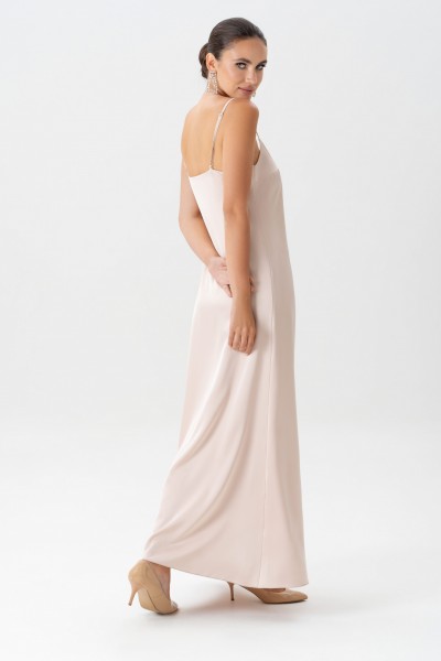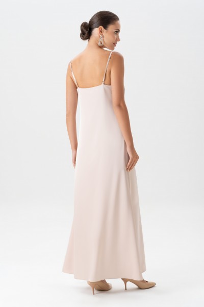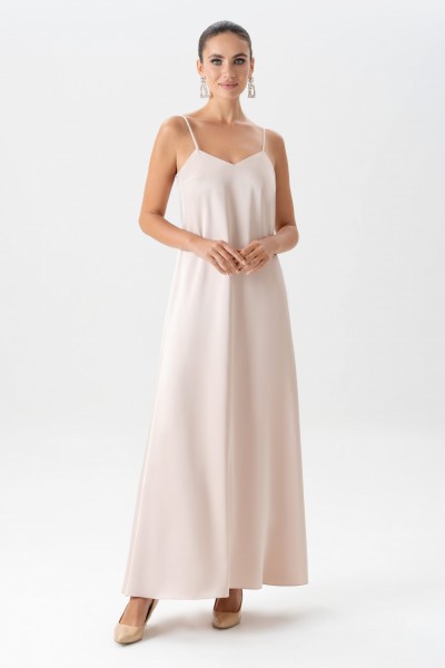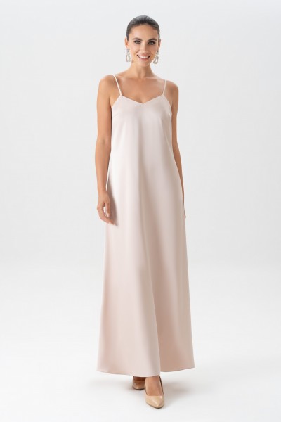 Платье полуприлегающего силуэта, на бретелях, слегка расклешенное к низу, длинное, на отлетной по низу подкладке. Перед с нагрудными вытачками, выходящими из боковых швов. Верхняя часть переда ˅- образная, углубленная. Средняя длина блузона по середине спинки 44,0 см, (±2,0 см);