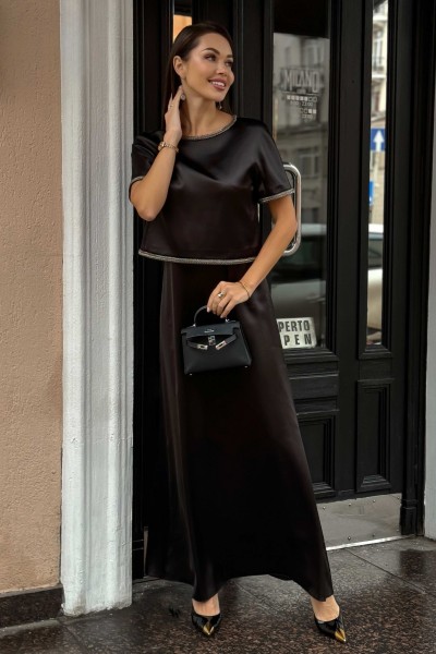 Нарядный женский костюм с платьем от брендов URS — это утончённый праздничный комплект, созданный для тех, кто выбирает изысканность, благородство и проверенную временем классику. Такой вечерний костюм прекрасно вписывается в атмосферу торжества, подчеркивает женственность и обеспечивает комфорт на протяжении всего события. Костюм женский, состоящий из блузона и платья, выполненных из плательной атласной ткани, нарядный.