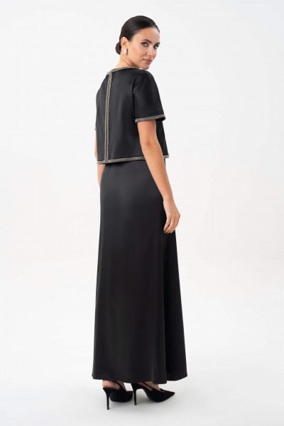 Низ переда, спинки и рукавов, горловина, застежка спинки вдоль молнии декорированы отделочной тесьмой из сетки с нашивными бусинами (размер и цвет фурнитуры может незначительно отличаться от фото).