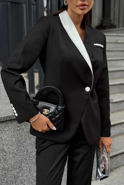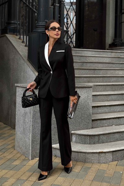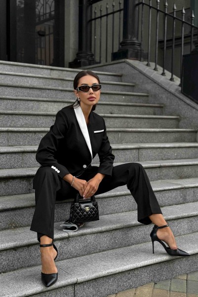 Элегантный черный брючный костюм URS — воплощение женственности, уверенности и безупречного вкуса. Этот женский брючный костюм создан для современных женщин, которые ценят классику, элегантность и комфорт в каждом движении. Стильный контраст черного и белого придает образу благородную строгость и подчеркивает индивидуальность, создавая гармоничное сочетание делового и утонченного стиля. Костюм женский ЮРС, нарядный, состоит из жакета и брюк, выполнен из костюмно - плательной ткани. костюмно-плательной ткани.