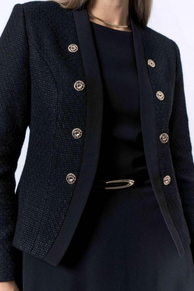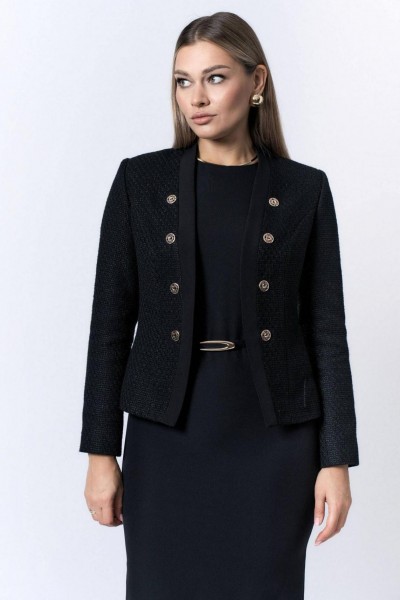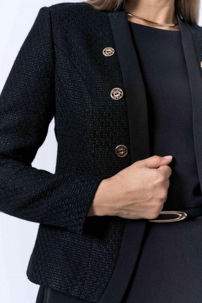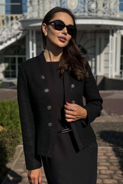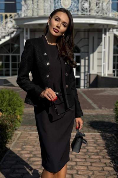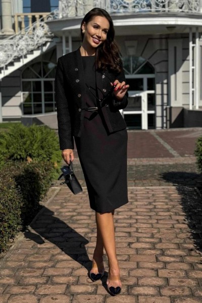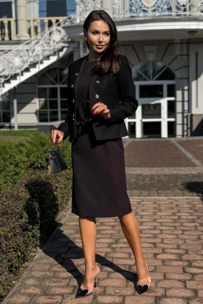 Этот изящный черный костюм — идеальный выбор для уверенной и стильной женщины. Жакет с золотистыми пуговицами и изысканной текстурой добавляет благородства и элегантности, при этом создавая структурированный силуэт. Прямое платье в тон подчеркивает фигуру, сохраняя утончённый образ. Этот ансамбль подойдет для деловых встреч, светских мероприятий или торжественных случаев, когда важно выглядеть безупречно и привлекательно. Костюм гармонично сочетается с минималистичными аксессуарами, делая акцент на элегантности и сдержанности стиля.