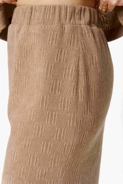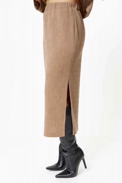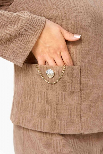 Трикотажный женский костюм из структурной ткани. Жакет прямого силуэта переду центральная застежка на 3-и петли и пуговицы и потайные кнопки. По переду накладные карманы декорированные цепью и застежкой на петлю и пуговицу. Спинка со средним швом без особенностей. Рукава втачные двухшовные. Юбка прямая длиной миди без подкладки. По правому боковому шву разрез. Для максимально комфортной посадки по поясу эластичная резинка.