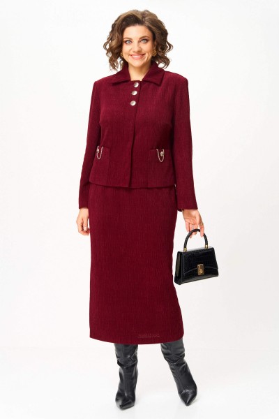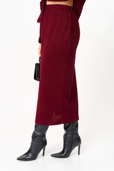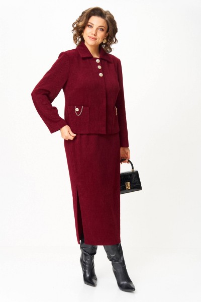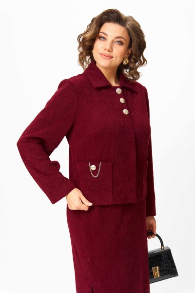 Трикотажный женский костюм из структурной ткани. Жакет прямого силуэта переду центральная застежка на 3-и петли и пуговицы и потайные кнопки. По переду накладные карманы декорированные цепью и застежкой на петлю и пуговицу. Спинка со средним швом без особенностей. Рукава втачные двухшовные. Юбка прямая длиной миди без подкладки. По правому боковому шву разрез. Для максимально комфортной посадки по поясу эластичная резинка.