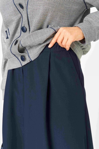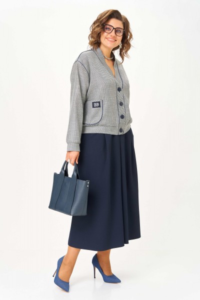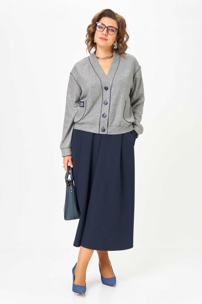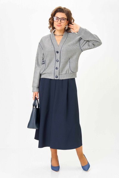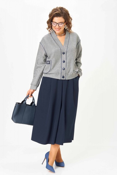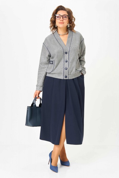Этот костюм — воплощение интеллектуальной элегантности. Мягкий светло-серый кардиган с коричневыми кантами и крупными пуговицами создаёт образ уютного шарма. V-образный вырез визуально вытягивает шею, а контрастные детали подчёркивают чёткость линий. Рукав на спущенной плойме и манжетой по низу. По перду накладные карманы с декоративной нашивкой. Коричневая юбка миди с глубокими встречными складками и разрезом по переду добавляет образу женственности. В боковых швах карманы. Юбка на подкладке. Для максимально комфортной посадки по бокам пояса вставлена эластичная резинка. Сочетание мягкого верха и строгого низа создаёт баланс между комфортом и аккуратностью, делая комплект универсальным для офиса, повседневных выходов и стильных деловых встреч.