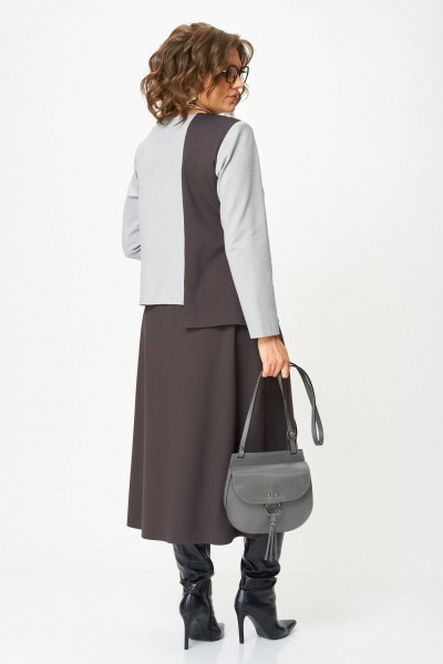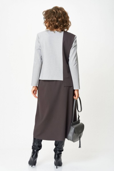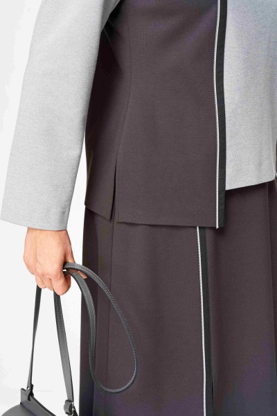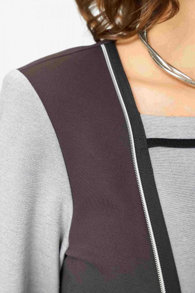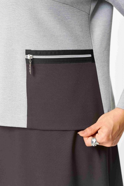 Туника: Асимметричный крой с контрастной черной окантовкой. Основной цвет — светло-серый, с вставками темно-коричневого. Туника оснащена карманом с молнией, низ изделия фигурный, в правом боковом разрез (длина разреза 11 см) Рукав втачной одношовный длинный. Спинка ассиметричная с контрастной вставкой. Внутренняя подкладка отсутствует, что обеспечивает легкость и воздухопроницаемость.