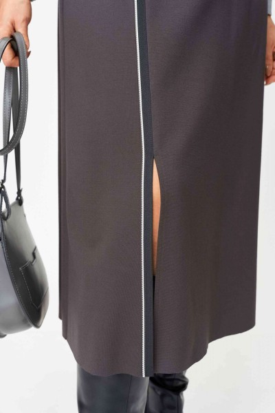 Юбка слегка расширена к низу длиной миди (до середины икры). По левой части переда юбки настрочной декоративный кант и разрез (длина разреза 30см). Застежка в левом боковом на потайную молнию с петлей и пуговицей. По спинке пояса эластичная резинка.