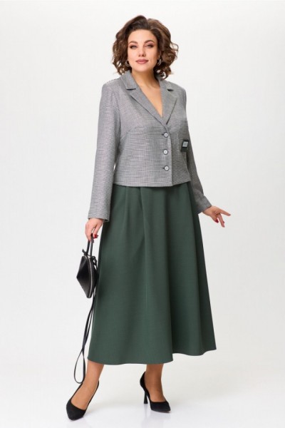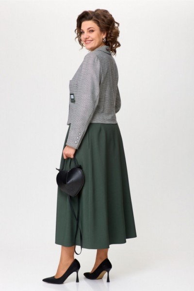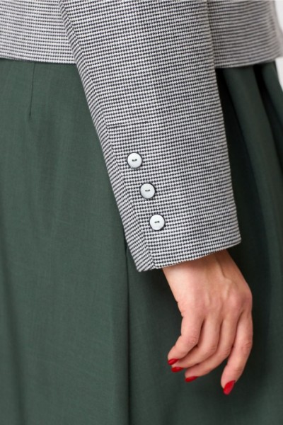 Комплект женский состоит из жакета и юбки. Элегантный женский жакет без подкладки с воротником пиджачного типа и застежкой на 3-и петли и пуговицы. По левой части переда накладной карман с декоративной нашивкой. Рукав втачной двухшовный со шлицей по низу и петлями с пуговицами. Юбка А-образного силуэта со складками по переду, в боковых швах карманы. Юбка на подкладке. Для максимально комфортной посадки по бокам пояса вставлена эластичная резинка.