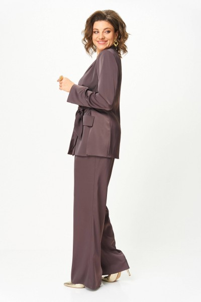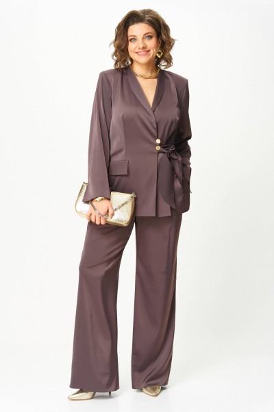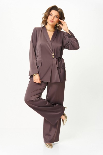 Изысканный костюм, воплощающий элегантность и уверенность. Мягкий сатиновый блеск ткани придаёт образу утончённый вечерний шарм, а глубокий сливочно-шоколадный оттенок создаёт впечатление благородного спокойствия и сдержанной роскоши.