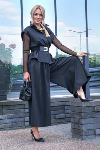 Состав ткани: Жилет, юбка - брюки 60% полиэстер, 37% вискоза,3% эластан ( мэмори) . блуза сетка 98% полиэстер, 2% спандекс