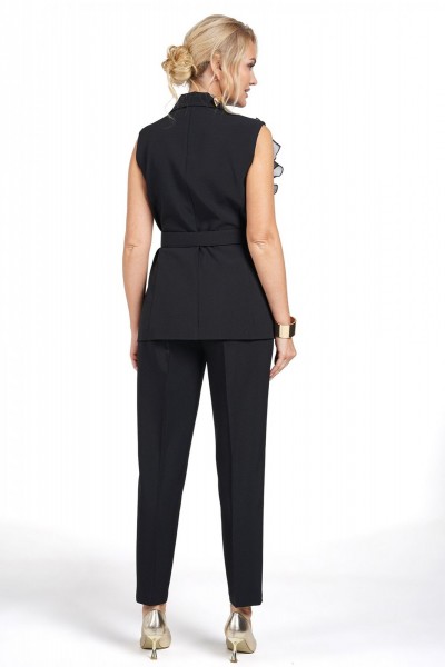 Жилет полуприлегающего силуэта, с застёжкой на петли, пуговицы, в дополнении с ремнем. Декорированный по переду воланами (выполненные из отделочной ткани органза). Перед с рельефными швами и декоративным клапаном. Спинка со средним швом и рельефными швами. Воротник отложной с отворотом.