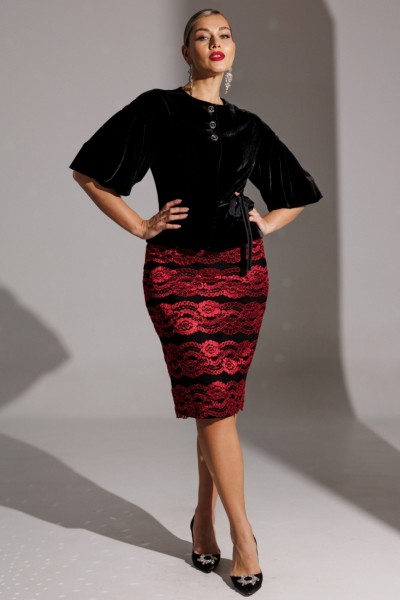 Нарядный комплект, состоящий из жакета и юбки. Комфортный жакет из велюра полуприлегающего силуэта с центральной комбинированной застежкой на 3 пуговицы и 3 потайные кнопки. Спинка со средним швом и талиевыми вытачками. По переду также талиевые вытачки. Горловина округлой формы. Объемные фантазийные рукава со складками смягчают строгий силуэт. Декором выступают декоративные пуговицы и завязка на талии. Шикарная юбка из сетки с серебряным напылением заужена к низу. Молния и шлица в среднем шве. По талии кокетки. Костюм на подкладке. длина спинки жакета: 54 см длина юбки: 65 см длина рукава от горловины: 55 см