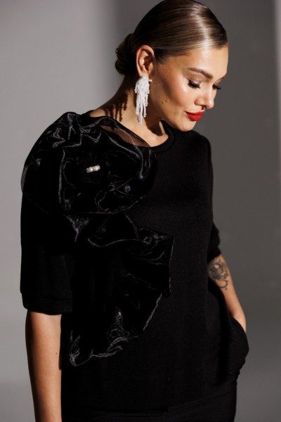 Создать нарядный образ с брюками возможно вместе с нашей новинкой ! Комплект состоит из блузы и брюк. Блуза выполнена из тонкого, струящегося трикотажа, имеющего в составе ангору. Блуза полуприлегающего силуэта, по низу с перепадом длины. Перед декорирован акцентным дизайнерским цветком из органзы. Рукав втачной с манжетой. Брюки классические, прямого силуэта, с заутюженными стрелками, боковыми карманами шлевками для ремня. длина спинки блузона: 67 см длина брюк: 109 см