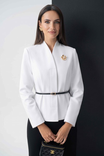 Спинка со средним и рельефными швами. Рукава втачные, двухшовные, длинные. Горловина ˅- образная, переходящая в воротник - стойку по спинке. Жакет с плечевыми накладками.