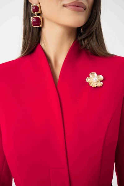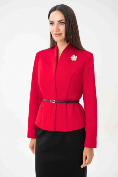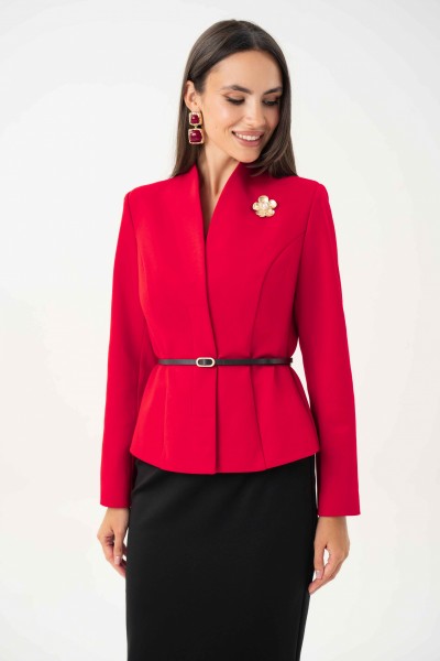 Спинка со средним и рельефными швами. Рукава втачные, двухшовные, длинные. Горловина ˅- образная, переходящая в воротник - стойку по спинке. Жакет с плечевыми накладками.
