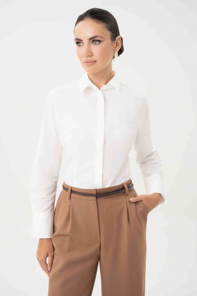 Брюки женские, прямые, на притачном поясе, с 5-ю шлевками, с застежкой на тесьму - «молнию», расположенную в среднем шве передних половинок. Пояс застегивается спереди на 1 пришивной крючок, 1 потайную петлю и пуговицу. Передние половинки брюк с односторонними складками, с боковыми наклонными карманами. Складки застрочены от пояса вниз на 3,0 см. Задние половинки с вытачками. Брюки без заутюженных стрелок.