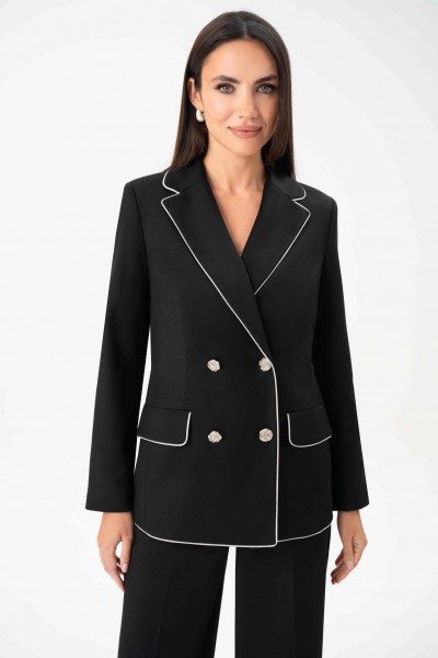 Воротник, лацканы, борта, низ переда и спинки обработан отделочным серебристым кантом. Жакет с плечевыми накладками.
