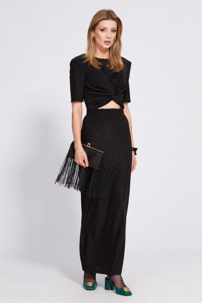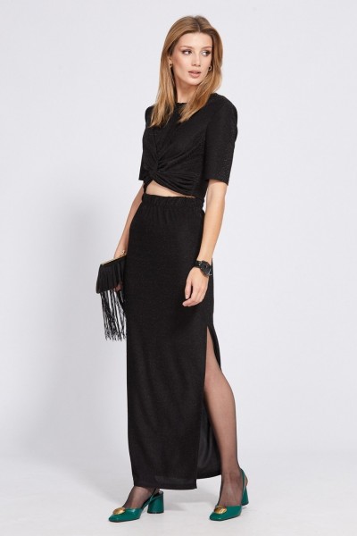 Комплект: блузка + юбка. Комплект выполнен из трикотажного полотна с люрексом. Блузка приталенного силуэта длиной до линии талии. Спереди средний шов с застежкой на потайную молнию, перекрут со сборками по боковыми швам. Спинка цельная. Рукав втачной одношовный, длиной до линии локтя. Блузка с плечевыми накладками, на подкладке. Юбка длиной макси, зауженная к низу. Переднее и заднее полотнища цельные. В левом боковом шве разрез. Юбка на цельнокроеном поясе. Юбка без подкладки.