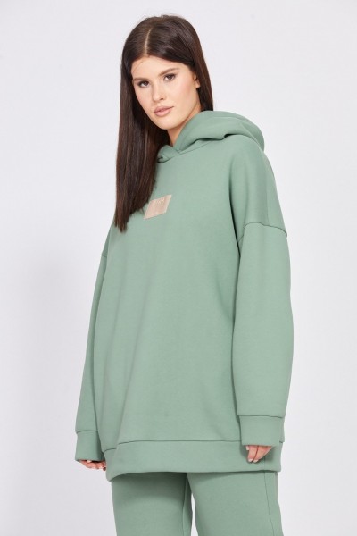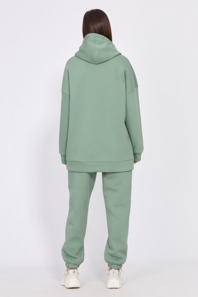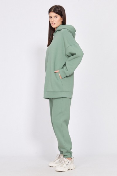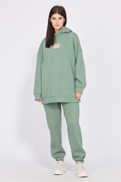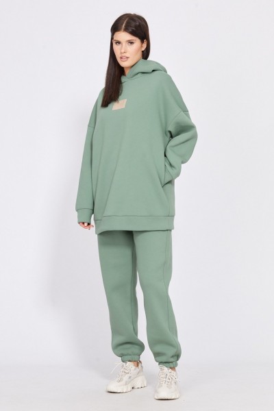 Комплект: джемпер + брюки. Комплект выполнен из однотонного трикотажного полотна на флисе. Джемпер прямого силуэта, покроя оверсайз, длиной ниже линии бедер. Перед и спинка цельные, перед декорирован настрочной нашивкой из натуральной кожи. Плечевой шов спущен. Горловина округлой формы, обработана капюшоном. Рукав одношовный, на притачной манжете. В боковых швах карманы. Низ джемпера на манжете. Брюки на притачном поясе с эластичной тесьмой, заужены к низу, в боковых швах карманы. Низ брюк на манжете с эластичной тесьмой.