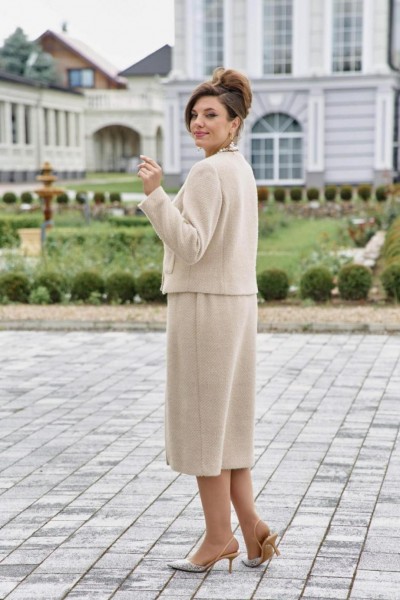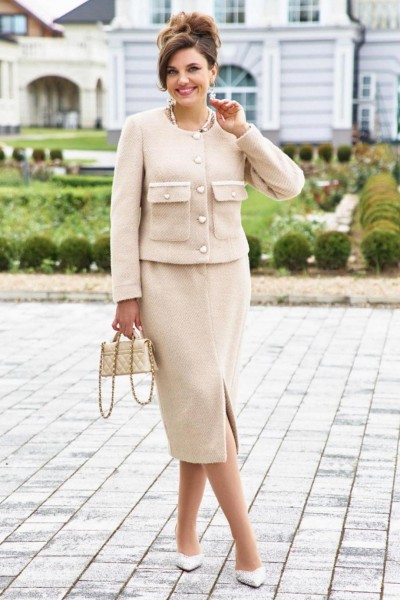 Безумно красивый и стильный костюм с элементами стиля «шанель» в восхитительном карамельном оттенке. Жакет полуприлегающего силуэта, укороченный с центральной застежкой на пять петель и пуговиц, округлым вырезом горловины. По переду жакета фигурные рельефы, накладные карманы и декоративные клапаны с отделочными пуговицами. В качестве дополнительной декоративной отделки по клапанам кармана- отделочная тесьма с жемчужной нитью. Спинка с фигурными рельефами. Рукав в жакете втачной, двухшовный. Жакет на подкладке. Юбка прямого силуэта, слегка заужена к низу, с разрезом в среднем шве по переду. Пояс в юбке притачной со вставкой эластичной тесьмы в боках. По переду юбки имитация наклонных карманов. По заднему полотнищу юбки талиевые вытачки. Юбка на подкладке.