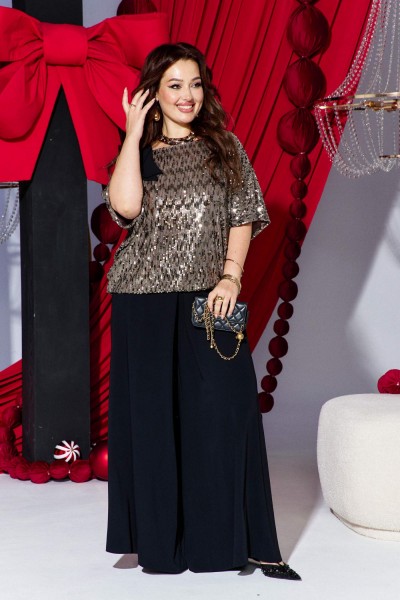 Это стильный и современный ансамбль, который состоит из блузы и брюк. Изысканный женский комплект идеален для торжественных мероприятий, он станет жемчужиной вашего гардероба. Брючный комплект можно дополнить минималистичными украшениями, которые подчеркнут утончённость, завершая этот элегантный, но уверенный образ. Сочетание классического чёрного цвета со сверкающими пайетками в одном образе превратит обыденное событие в настоящий феерический праздник! Блуза выполнена из мерцающих пайеток богатого кофейного оттенка создаёт невероятно праздничный образ. Блуза свободного силуэта с асимметричной формой горловины: одно плечо открыто, расположен декоративный элемент чёрного цвета из отделочной ткани. Рукав цельнокроеный. Спинка без особенностей. Блуза на подкладке. Брюки свободного кроя выполнены из плотной, матовой ткани чёрного цвета. Их широкий фасон и высокая посадка на талии создают элегантный и удлинённый силуэт, а также контрастируют с лёгким и воздушным верхом. Пояс в брюках притачной со вставкой эластичной тесьмы-резинки в бочках. По переду брюк от пояса застрачивается складка. В среднем шве брюк застёжка на потайную тесьму молнию и пуговицу в поясе.