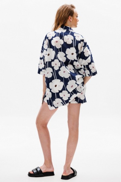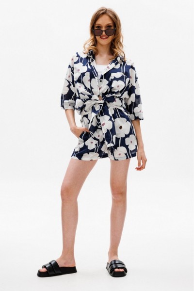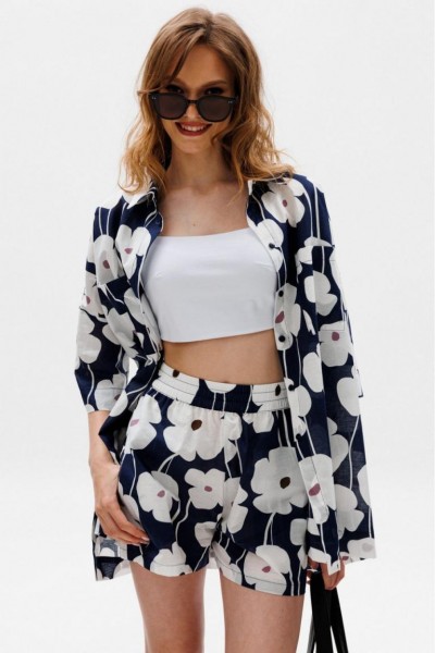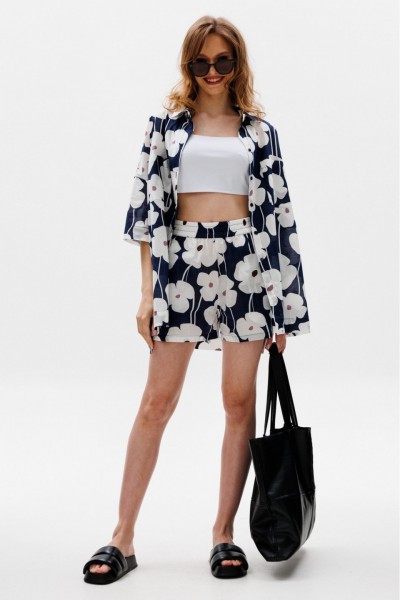 Комплект: блузка + шорты. Топ в комплект не входит. Комплект выполнен из плательно-блузочной ткани. Блузка прямого силуэта, покроя оверсайз, длиной ниже линии бедер. Спереди накладные нагрудные карманы и центральная застежка на пуговицы. Спинка цельная, длиннее переда. Воротник стояче-отложной. Плечевой шов спущен. Рукав рубашечного покроя, длиной ниже линии локтя. В боковых швах разрезы. Шорты на притачном поясе с эластичной тесьмой, длиной до середины бедра. В боковых швах карманы. Шорты декорированы нашивкой спереди по поясу.