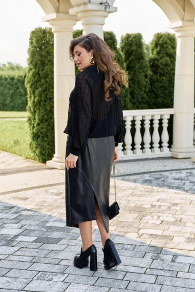 Комплект женский, состоящий из джемпера и юбки. Джемпер черного цвета, из полупрозрачного материала, его фактура — эффект гофре — это складки, они играют со светом, то поглощая его, то отпуская, создавая живое, дышащее полотно. Джемпер свободного силуэта, с планкой из отделочного материала переходящей в отложной воротник с застёжкой на декоративную тесьму-молнию. Рукав в джемпере- реглан со сборкой на притачную манжету из отделочной ткани. По спинке джемпера фигурная кокетка из отделочной ткани. Низ со сборкой на эластичную тесьму-резинку. Юбка прямого силуэта, удлинённая, зауженная книзу с отделочными строчками по рельефам и фигурной линией низа. Рельефы на переднем и заднем полотнище переходят в ассиметричные разрезы. Притачной пояс с эластичной тесьмой сзади обеспечивает максимально удобную посадку на любой тип фигуры. Застежка на молнию в боковом шве и пуговицу в поясе. Обращаем Ваше внимание, что фурнитура может незначительно отличаться от фото.