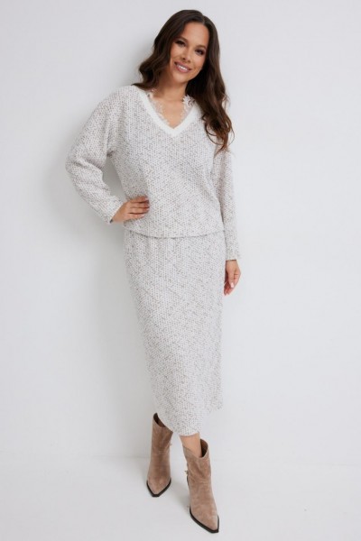 Элегантный и нежный комплект из джемпера и юбки, выполненных из вязаного, слегка пушистого трикотажного полотна с россыпью мелких , слегка мерцающих пришивных пайеток. Джемпер свободного кроя со спущенной линией плеча. Горловина с V- образным вырезом, дополненным нежным кружевом. Юбка прямого классического кроя с притачным поясом, дополненным эластичной тесьмой. Юбка на комфортной трикотажной подкладке. Длина джемпера от плечевого шва 64см. Длина рукава 60см. Длина юбки по боковому шву 79см.