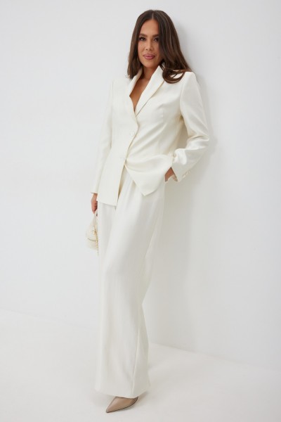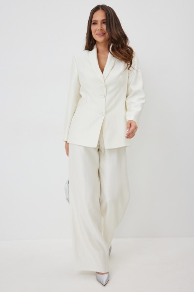 Элегантный и безумно красивый костюм из жакета и брюк. Выполнен из красивой гладкой костюмной ткани с легким отблеском. Жакет прямого свободного кроя с красивыми рельефами, на подкладке, с центральной застежкой на пуговицы. Брюки классического прямого кроя с притачным поясом, дополненным эластичной тесьмой. Дополнены удобными боковыми и задними карманами. Застежка гульфик на молнию и пришивную пуговицу. Длина жакета от плечевого шва 73см. Длина рукава 60см. Длина брюк 107см.