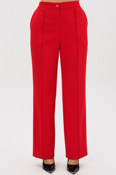 Брюки прямого кроя с высокой посадкой, выполнены из костюмной ткани (немного тянется) с наклонными карманами в боковых швах. По передним половинкам вертикальная застроченная складка на 0,5 см. По срезу банта – застежка-молния. Верхний срез оформлен поясом с эластичной резинкой по задней половинке.
