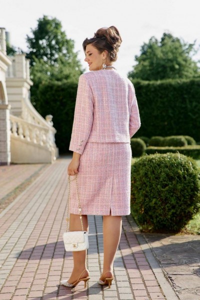 Костюм женский, состоящий из укороченного жакета и юбки-карандаш. Основа ткани — роскошный твид, в который искусно вплетена тонкая люрексовая нить, придающая полотну деликатное мерцание и благородный блеск. Жакет прямого силуэта с округлой формой горловины и линией борта. Застёжка на декоративные петли пуговицы по борту и потайные кнопки от низа жакета. По переду жакета фигурные рельефы и декоративные клапана карманов. Спинка с талиевыми вытачками. Рукав втачной, двухшовный, длинный с отделкой из декоративных пуговиц в шве. Жакет на подкладке. Юбка прямого силуэта, удлинённая, с талиевыми вытачками. Пояс в юбке притачной со вставкой эластичной тесьмы в боках. В среднем шве спинки юбки застёжка на потайную тесьму-молнию и пуговицу в поясе. По низу юбки отлетная шлица. Юбка на подкладке. Обращаем Ваше внимание, что фурнитура может незначительно отличаться от фото.