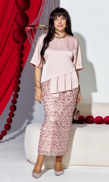 Комплект женский юбочный, состоящий из блузы и юбки. Комплект идеально подходит для вечерних торжеств, где важна каждая деталь, чтобы подчеркнуть изысканную женственность и уверенность в себе — светлый, элегантный и чуть волнующий наряд, который оставляет за собой шепот восхищения. Сочетание матового атласа и зеркального блеска пайеток создает идеальный дуэт. Блуза свободного силуэта, горловина округлой формы. По переду джемпера декоративная отлетная складка, с воланом с заложенными декоративными складками, он живет своей жизнью, колышется при каждом шаге, добавляя динамики и легкости верху. Он не пришит намертво, он «отлетает», создавая ощущение незавершенности и художественного хаоса. Рукав в блузе цельнокроеный, длиной ¾. Спинка в блузе со средним швом. Низ в блузе ассиметричный. Юбка прямого силуэта, длины миди с притачным поясом с эластичной тесьмой-резинкой в круговую, что обеспечивает максимально удобную посадку на любой тип фигуры. В среднем шве юбки разрез от низа.