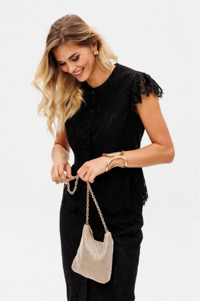 Комплект: блузка + юбка. Комплект выполнен из гипюра. Блузка приталенного силуэта, длиной выше линии бедер, отрезная по линии талии. Спереди рельефы и центральная застежка на пуговицы. Горловина округлой формы. На спинке рельефы. Рукав-крыло по окату. Низ блузки в виде баски, присборенной по линии талии. По низу рукавов и баски фестоны. Блузка на притачной по низу подкладке. Юбка зауженная к низу, длиной миди, на притачном поясе. Спереди центральная застежка на пуговицы. По низу юбки фестоны. Юбка на отлетной по низу подкладке.