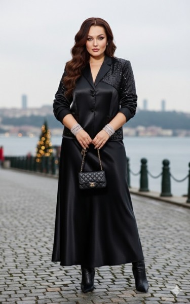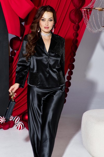 Предлагаем вашему вниманию эффектный праздничный юбочный костюм насыщенного черного цвета состоящий из жакета и юбки идеально подобранные по цвету две разные фактуры атлас и пайетки прекрасно дополняют друг друга. Жакет классического кроя с асимметричным подрезом по переду жакета и верхней части рукава, а также спинки из отделочной ткани пайетки. Жакет полуприлегающего силуэта с нагрудной вытачкой из низа по переду, воротник пиджачного типа с отложенным бортом на три пришивные обтянутые пуговицы. Рукав втачной двухшовный пиджачный с отделочными элементами вверху, спинка со средним швом и отделочные кокеткой. К жакету прилагается пояс из атласной ткани. Юбка удлинённая по косой с притачным поясом по задней части с резинкой для максимального удобства на все типы фигуры и застёжкой сбоку на молнию.