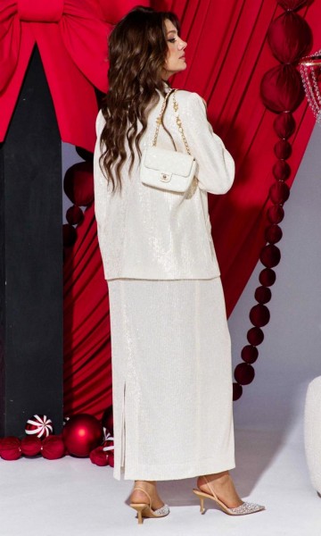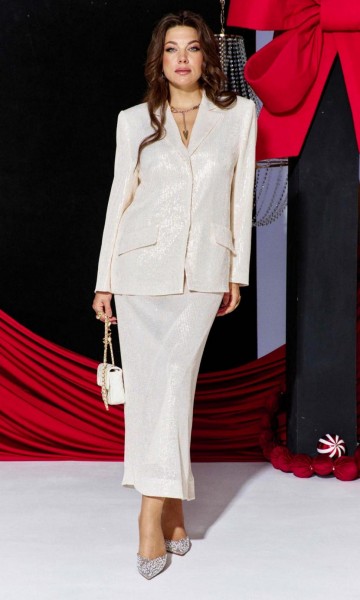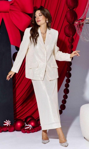 Это не просто женский юбочный костюм — это будто вторая кожа, сотканная из ночных огней и лунной пыли. Пайетки, бесчисленные и плотно прилегающие друг к другу, словно чешуя диковинной рыбы, не просто сверкали. Они жили своей собственной, мерцающей жизнью, рождая на своей поверхности целую вселенную из бликов. Костюм женский, двухпредметный, состоящий из жакета и юбки. Жакет однобортный, «оверсайз» силуэта, с акцентом на ровную линию плеч, с цельнокроеными отложными лацканами и потайной застёжкой на пришивные кнопки по краю борта. По переду жакета нагрудные вытачки и декоративные клапана карманов. Спинка в жакете со средним швом. Рукав в жакете втачной, одношовный, длинный. Жакет на подкладке. Юбка длины «миди», обтачная по верхнему срезу подкладкой. В среднем шве заднего полотнища юбки застёжка на декоративную тесьму-молнию в среднем шве. От низа юбки в среднем шве разрез. Юбка на подкладке.