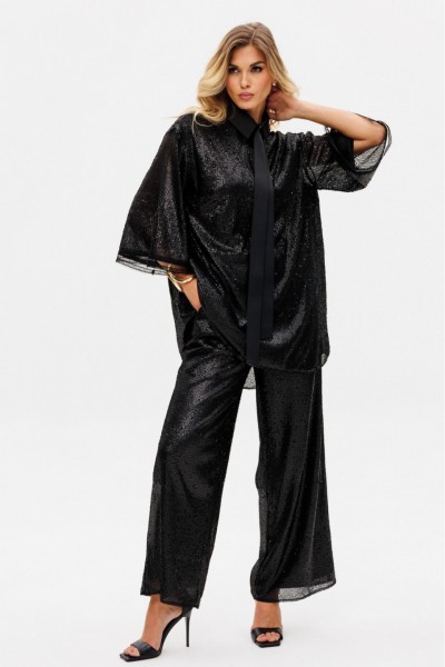 Комплект: блузка+брюки. Комплект выполнен из трикотажного полотна в пайетки. Блузка прямого силуэта, длиной ниже линии бедер. Перед и спинка цельные. Спереди застежка на пуговицы. Стояче-отложной воротник с отрезной стойкой. Плечевой шов удлинен. Рукав рубашечного покроя, одношовный, длиной ниже линии локтя. Низ рукава декорирован тесьмой-кружевом. В комплект входит съемный галстук. Галстук и воротник выполнены из атласа. Низ блузки фигурной формы. Блузка на отлетной по низу подкладке. Брюки прямого силуэта, длиной до линии щиколотки, на притачном поясе с эластичной тесьмой. В боковых швах карманы. Брюки на отлетной по низу подкладке.