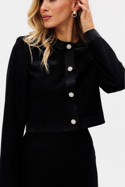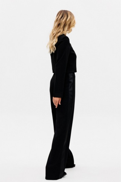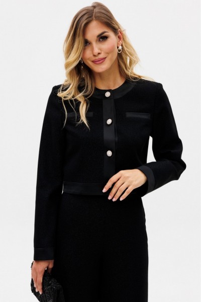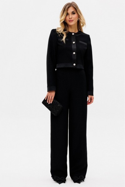 Комплект: жакет + брюки. Комплект выполнен из костюмной ткани с блеском. Жакет прямого силуэта, до линии талии. Спереди рельефные декоративные карманы, застежка на пуговицы. На спинке средний шов. Горловина округлой формы. Край борта и низ жакета обработаны планкой из отделочной ткани. Рукав втачной, двухшовный. Жакет на притачной по низу подкладке. Брюки прямого силуэта, длиной до пола, без пояса. По боковым швам лампасы из атласа. Сзади в среднем шве застежка на потайную молнию.
