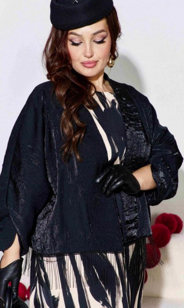 Предлагаем вашему вниманию изысканный плательный комплект состоящий из укороченного жакета и платье прямого силуэта. Сочетание разных фактур - крэш с отливом в жакете и шелковистое вискозное платье создают благородный ансамбль. Жакет прямой свободного силуэта с цельнокроеным рукавом, перед без застежки с широкой линии борта и не высокой цельнокроенной стойкой. Низ переда обработан декоративной тесьмой - бахрома. По рукаву декоративная складка низ рукава фигурной формы. Спинка по среднему шву со встречной складкой. Жакет выполнен на подкладке. Платье прямого силуэта со спущенным плечом и со шлицей сбоку. Горловина платья округлой формы по переду треугольный подрез на уровне груди. Платье выполнено на подкладке.